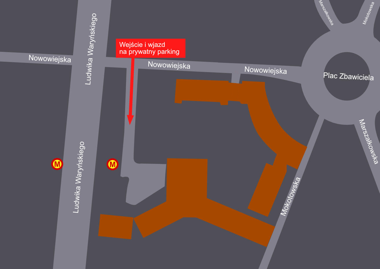 Wejście i wjazd na prywatny parking przez bramę od ulicy Nowowiejskiej róg Waryńskiego przy stacji metra Politechnika.